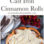 To finish, the Cast Iron Cinnamon Rolls are covered with a decadent cream cheese frosting and served while still warm.