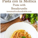 Pasta con la Mollica (Pasta Mollicata, Pasta e Mollica, Pasta ca’ Muddica) is a quick option perfect for using up leftover bread and other pantry staples. It originally comes from Southern Italy with variations across Basilicata, Puglia, Calabria, and Sicily.