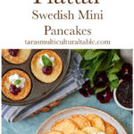 A recipe for Plättar (Swedish Mini Pancakes)! These small, thin pancakes are made in a specialty pan for a fun pairing with lingonberry jam and whipped cream.