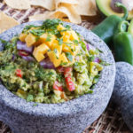 A recipe for Mango Guacamole! Mashed avocados are mixed with mango, tomato, jalapeños, red onion, and red pepper for an easy and flavorful appetizer.