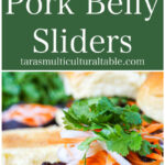 Thinly sliced pieces of pork belly are marinated in a hoisin-based sauce, pan-fried, then stacked on a slider bun with pickled carrot and daikon radish, green onion mayonnaise, and cilantro.