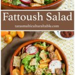 Fattoush is a Lebanese bread salad made from tossing toasted pita chips with various chopped vegetables and seasoning with a lemon sumac vinaigrette.